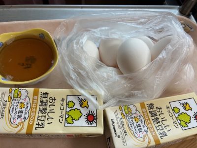 豆乳・ハチミツ・砂糖を加えたものを容器にいれます レンジでチンしますよ・・・